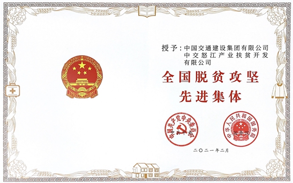 大会对全国脱贫攻坚先进个人、先进集体进行表彰,中国交通建设集团有限公司中交怒江产业扶贫开发有限公司荣获全国脱贫攻坚先进集体。中交集团党委书记、董事长、总经理王彤宙在现场参加大会。